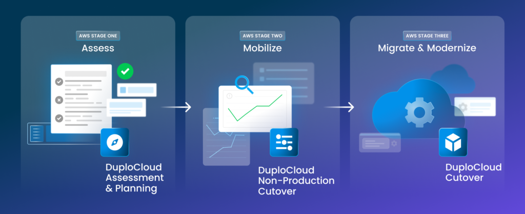 This is where DuploCloud provides immeasurable value. Our end-to-end support provides the planning and expertise you need to ensure a seamless migration that saves both time and money. At each of AWS's three crucial migration stages, DuploCloud offers vital support, making your journey smoother and more cost-effective.