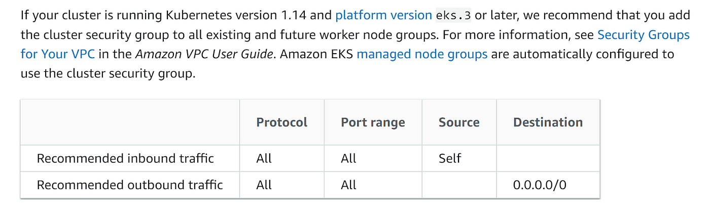 The guidelines are strict and many ignored at the DevOps layer. “Production access should be strictly controlled, time bound and only need-basis” is easier said than done. Many changes are dependent on the initial setup and require reprovisioning of resources like the separation of VPCs between production and staging, moving unencrypted databases etc. Technologies like Kubernetes recommend wide open ports across all nodes in the cluster. Below is an official security group recommendation from AWS.