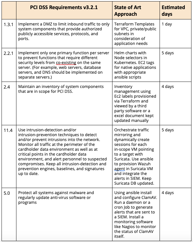 Table 1 shows a snippet of the PCI controls with a sample implementation using Infrastructure-as-code technique. If we complete this costing exercise for each of the 74 applicable PCI control then we could say that