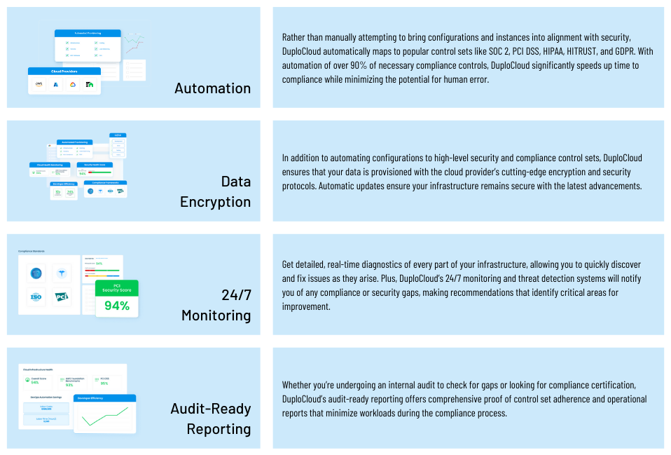 | Did you know? | DuploCloud automatically adheres to stringent control sets like PCI DSS, HIPAA, and HITRUST at the infrastructural level, taking the guesswork out of meeting compliance across a variety of industries and use cases. |