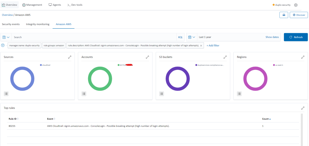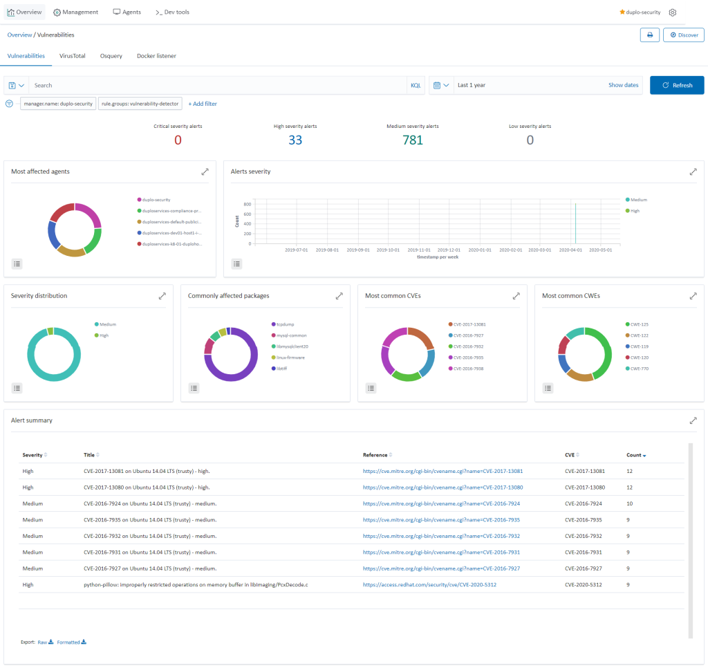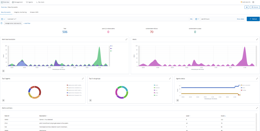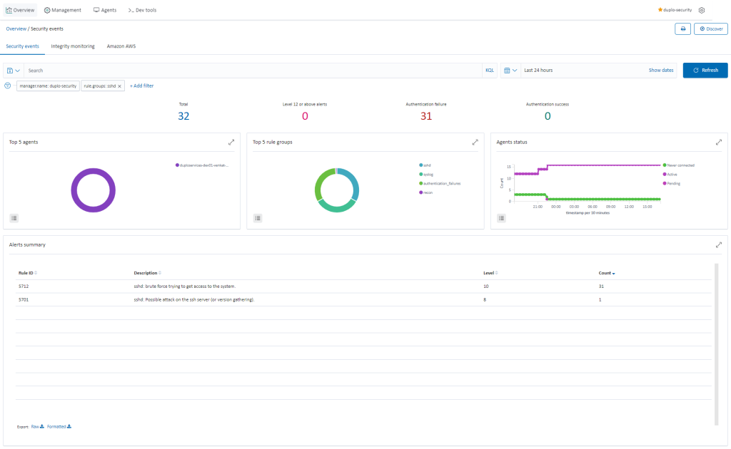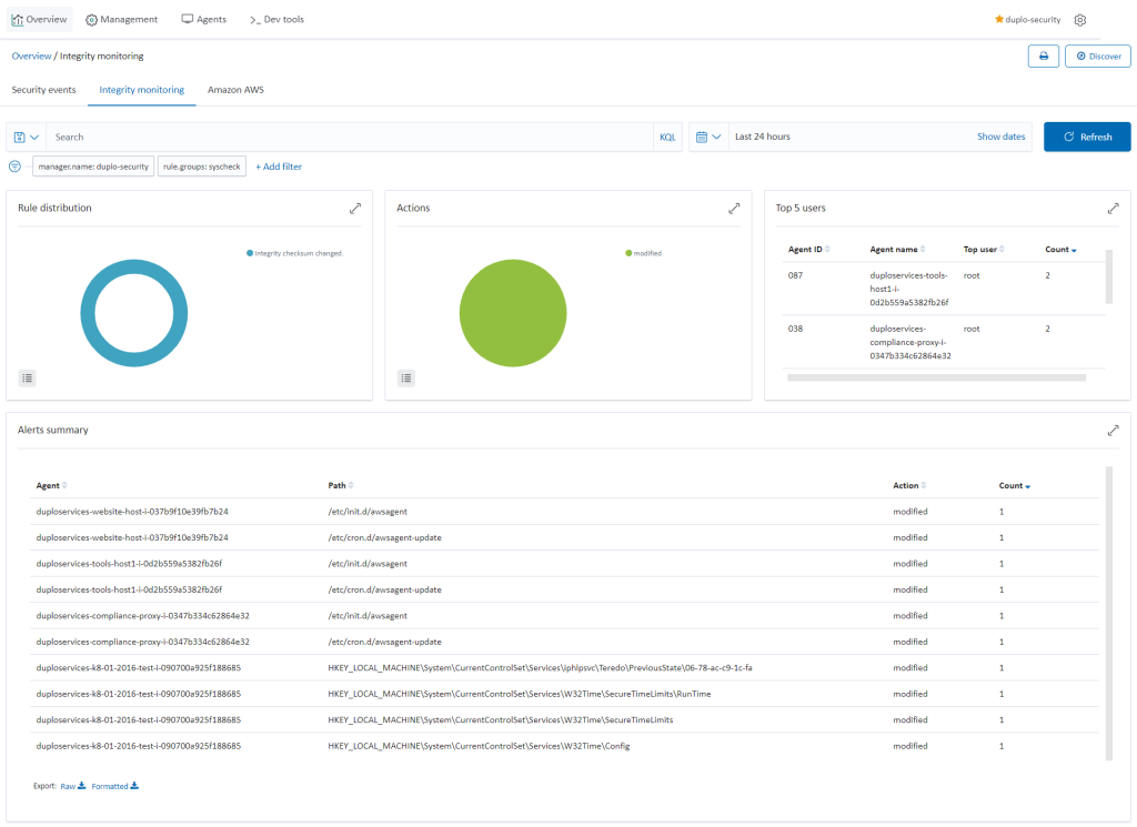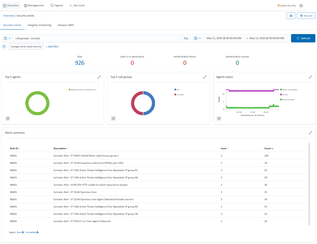 | 10. | §164.308(a)(6)(ii) Identify and respond to suspected or known security incidents; mitigate, to the extent practicable, harmful effects of security incidents that are known to the covered entity or business associate; and document security incidents and their outcomes. | Duplo orchestrates with Wazuh as SIEM. Wazuh agents are automatically installed in the hosts and is integrated with various services like CloudWatch, cloud trail, inspector and Suricata. Which collects the vulnerabilities, and all of those vulnerabilities can be view in one page. |