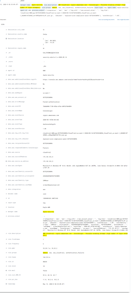 | 23. | §164.312(b) Implement hardware, software, and/or procedural mechanisms that record and examine activity in information systems that contain or use electronic protected health information. | DuploCloud maintains trails in 2 places in addition to cloud trail. It logs all write events about infrastructure change in an ELK cluster. Further, Wazuh agent tracks all activities at the host level. All 3 - Cloud trail, audit and Wazuh agent events are brought together in the Wazuh dashboard. |