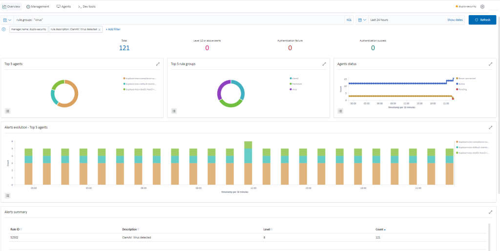 | 8 | 0663.10h2System.9 - The operating system is required to have in place supporting technical controls such as antivirus, file integrity monitoring, host-based (personal) firewalls or port filtering tools, and logging as part of their baseline. | DuploCloud enables ClamAV, file integrity monitoring, and log collection via agent modules and alerts are collected in Wazuh. Host based firewall rules are implemented at the Cloud Service Provider level. |